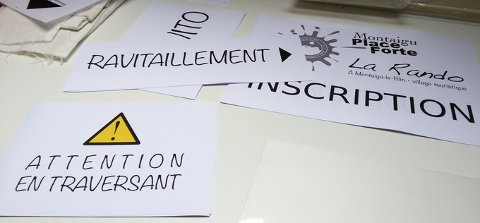 Notre Présidente souhaitait minimiser l'usage des peintures de marquage au sol, de façon à inscrire l'association dans une démarche plus écologique et continue à celle des gobelets réutilisables. À défaut de trouver des peintures éphémères non polluantes et dans les coloris requis pour le balisage des quatre parcours, il ne restait qu'une solution, celle du fléchage sur piquet. Une solution demandant plus d'effort à la réalisation et pour le plantage des piquets tout le long des parcours. Hélas, dans le commerce, il n'y avait pas ou peu de choix qui pouvait satisfaire nos exigences. Par bonheur, une idée lumineuse est venue résoudre le problème : puisque l'association dispose d'une plastifieuse et que les matériaux requis (pochettes plastifiantes) sont facilement disponibles à l'achat sur Internet, il ne restait plus qu'à créer nous-mêmes les flèches en les imprimant sur papier. Notre Secrétaire, informaticien et graphiste amateur, a pu imaginer un visuel approprié et imprimer pas moins de 90 unités sur une imprimante laser (résistance de l'encre dans le temps). Plastifiée entre deux films de 125 µm d'épaisseur, la rigidité obtenue était suffisante.