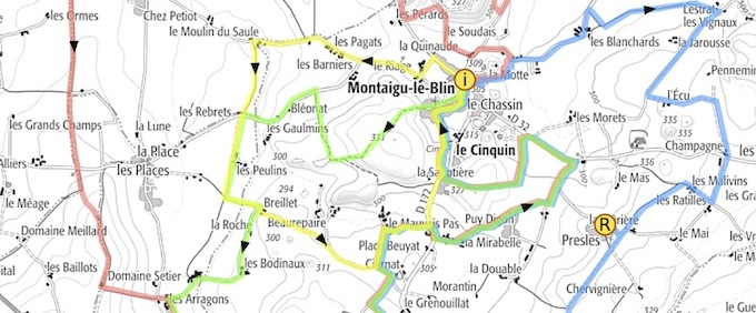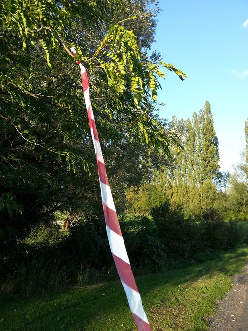 Et pour la couleur des parcours ? Au fil des recherches sur Internet, nous avons trouvé des gommettes (pastilles rondes adhésives) de 30 mm de diamètre, dans les couleurs désirées. Le visuel des flèches devait alors réserver un espace vide pour le collage des gommettes au-dessus de la flèche plastifiée, le nombre et les couleurs variant en fonction du ou des parcours (tronçon commun) auxquels elle était affectée. Les flèches ainsi obtenues étaient fixées sur piquet par vis ou par punaises. Elles sont réutilisables d'année en année et il sera possible de les affecter à n'importe quel parcours en remplaçant les gommettes (décollage / recollage).