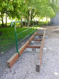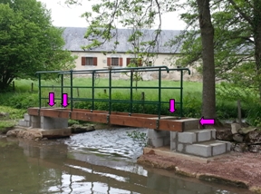 On remarquera, sur les parpaings, le scellement de la partie bois de la passerelle. Deux fixations par pilastre ont été réalisées. Les deux "petits ponts" évitent à la force de l'eau de porter atteinte à l'édifice en cas de crue. Cela ajoute également une touche esthétique. |