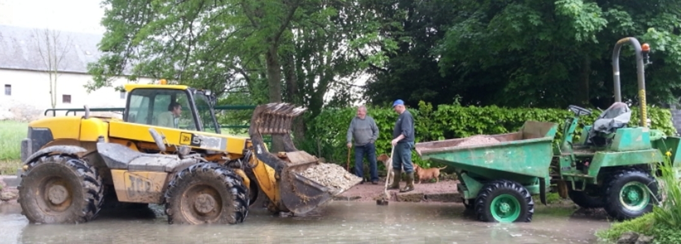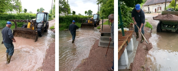 3 m3 de scalpage ont été nécessaires pour combler et mettre de niveau la sortie passerelle côté Montaigu-le-Blin. 1 m3 côté St-Gérand-le-Puy. 3 m3 pour combler les ornières du passage à gué. |