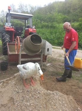 9 bétonnières ont été nécessaires pour remplir l'espace d'un cadre en chêne. Ce qui représente un poids unitaire d'environ 750 kg. NB: l'alimentation de la bétonnière se fait sous le contrôle attentif de l'oie Babette, notre chef d'équipe pendant les 10 jours. |