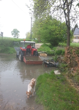 Pour acheminer le ciment de la "cimenterie" au chantier de construction, l'utilisation du tracteur d'André nous a été salutaire. Doté d'une benne, il nous a évité le roulage du ciment à la brouette ! Ce sont les pieds dans l'eau que nous avons commencé les fondations. |