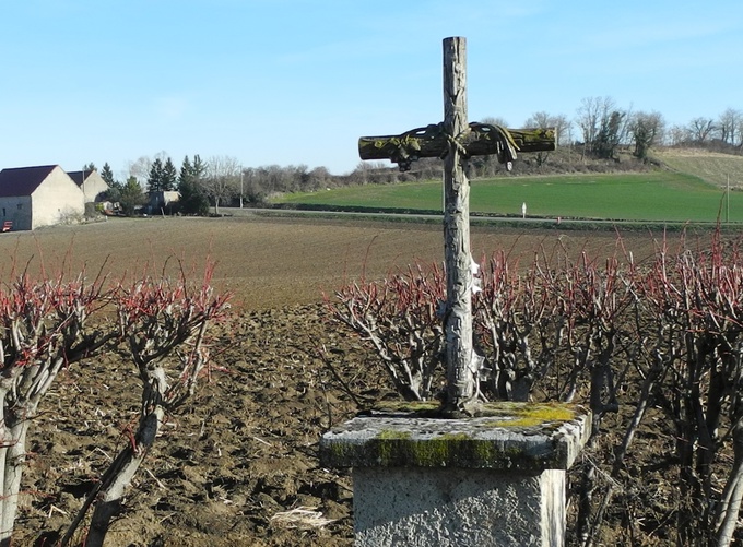 Sur la route Montaigu — Rongères, cette croix nous interpelle. Remarquez le lierre enroulé à sa base, et la grappe de raisin et l'épis de blé sur la ligne horizontale. Quels en sont la signification ? (- peut-être l'objet d'une prochaine question mystère ? -) L'avantage de la marche, c'est qu'on peut prendre le temps de s'arrêter et d'observer les objets insolites, chose que l'on fait rarement ou pas quand on est en voiture ou en vélo.