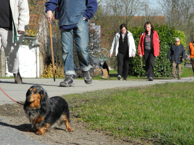Arrivés aux Places, les randonneurs de tête attendent patiemment ceux de la queue. Un teckel est de la partie dans cette marche. Tiendra-t-il la distance ?