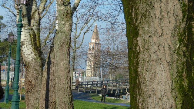 L'accès entre Mazzarbo et Burano se fait par un pont qu'on voit sur la photo. Au loin, un campanile qui penche un peu beaucoup, ou est-ce un effet d'optique ?