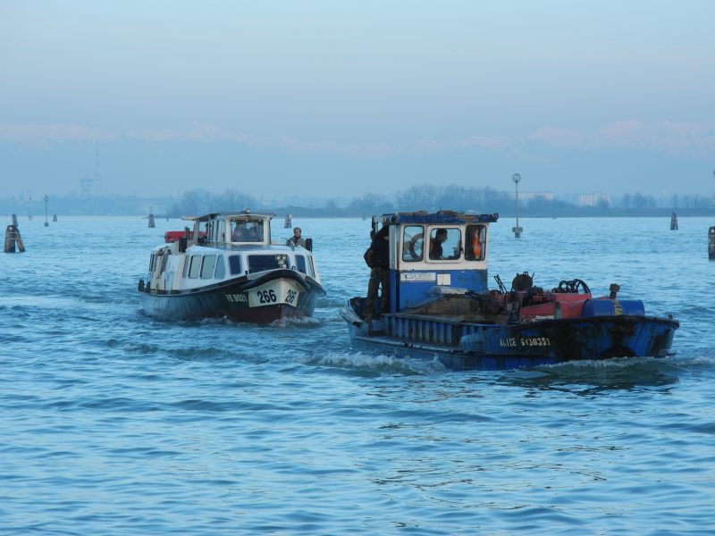 Un chalutier suivi, dans son sillage, par notre vaporetto qui nous emmène à la station Fondamente Nove pour la correspondance des îles. Dans le fond de l'image, en filigrane, la chaîne des Alpes.