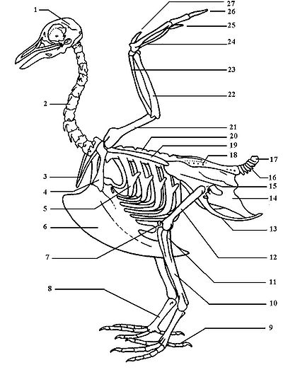 12- Fémur 13- Pubis 14- Ischium 15- Ilium 16- Vertèbres caudales 17- Pygostyle 18- Synsacrum 19- Scapula 20- Vertèbres 21- Humérus 22- Ulna 23- Radius 24- Carpo-métacarpe 25- 1er doigt, 2 phalanges 26- 3e doigt, 1 phalange 27- 2e doigt, 2 phalanges |